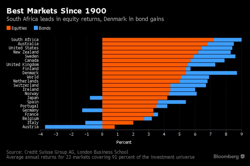 بهترین بازارها از نظر بازگشت سهام بین سال های ۱۹۰۰ تا ۲۰۱۶ اعلام شد.