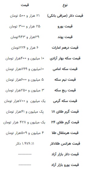 امروز نرخ فروش هر دلار آمریکا رد صرافی های بانکی ۲۱ هزار و ۵۰۰ تومان و نرخ خرید آن از مردم برابر با ۱۹ هزار و ۹۰۰ تومان اعلام شده است . صرافان هر یورو را به قیمت ۲۵ هزار و ۳۰۰ میفروشند و به نرخ ۲۳ هزار و ۴۰۰ تومان خریدای می کنند .با این خال قیمت سکه بار دیگر به کانال ۱۰ میلیونی برگشته است . این در حالی است که قیمت هر قطعه سکه تا مرز ۱۱ میلیون و ۳۰۰ هزار تومان رد روز گذشته پیشروی کرده بود.